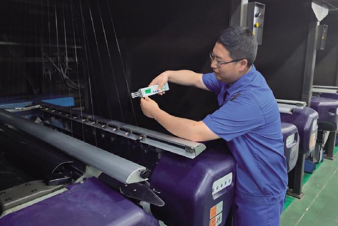 2022年,在王雨生和车间员工的共同努力下,德力化纤FDY车间被宿城区总工会授予“工人先锋号”荣誉称号。(王家欣)图为王雨生正在监测超细旦纤维的卷装张力。(恒力集团版权所有,如需转载请注明出处)