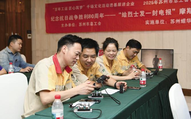 本报讯(记者 王嵘)“嘀——嘀嘀——”,8月14日,恒力集团接待中心三楼会议室内传来阵阵有规律的声响,30余人正全神贯注地操作着简易发报机发送信号,这是苏州市总工会和恒力集团为纪念抗日战争胜利80周年举办的特别活动——“给烈士发一封电报”摩斯密码探秘体验。活动通过“红色爱国主义+国防科技教育=追寻红色电波研学”的方式,以红色故事为驱动,让活动参与者们在喜闻乐见的趣味活动中接受国防教育,将爱国爱军的意识深植于心中。