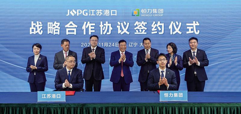 本报大连讯 11月24日,恒力集团与江苏省港口集团正式签署战略合作协议,双方务实合作迎来崭新里程。江苏省港口集团党委书记、董事长陈明,大连市副市长、长兴岛经济区党工委书记赵东,苏州港管理委员会副主任、办公室主任,江苏太仓港口管理委员会主任邵建林,恒力集团董事长、总裁陈建华出席仪式并致辞。