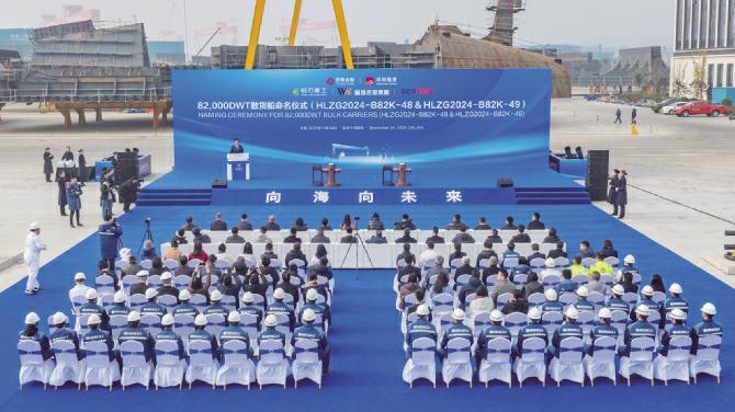 图为两艘82000载重吨散货船命名仪式现场。(恒力集团版权所有,如需转载请注明出处)