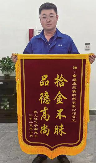 一面锦旗,一份认可,传递着浓浓的谢意与赞誉。2025年10月25日,康辉南通新材料科技有限公司热媒站班长郭鹏收到了一面写有“拾金不昧,品德高尚”的锦旗。这一暖心事迹在公司内部被传为佳话。