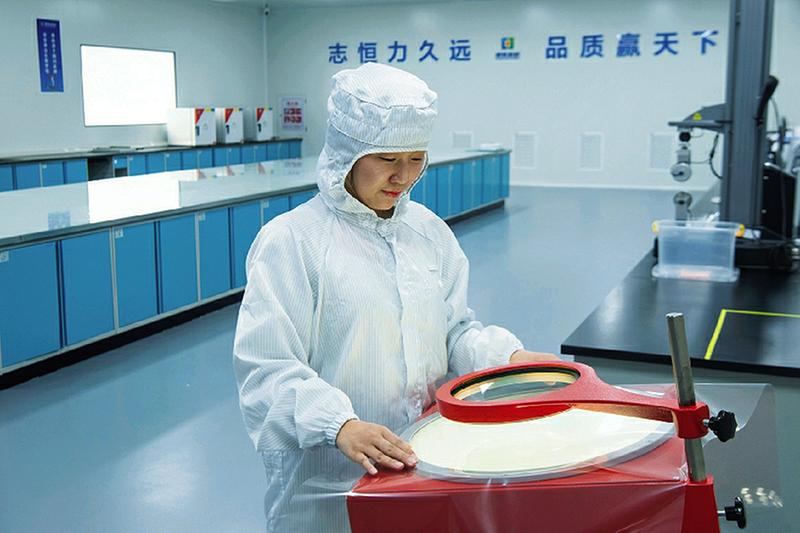 图为吴佳仪正在查看偏光镜以排查薄膜疑似缺陷。(恒力集团版权所有,如需转载请注明出处)